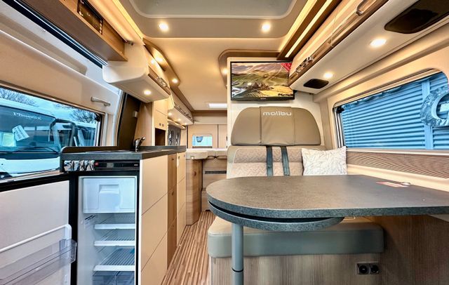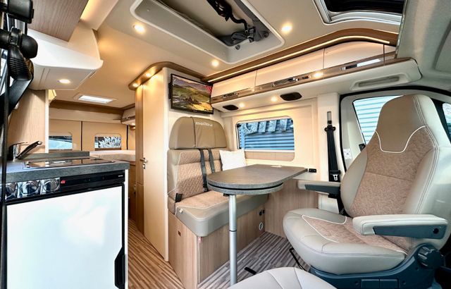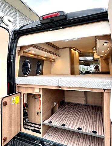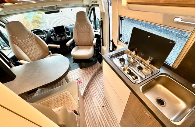 Aufbau-Paket:Dachinnenverkleidung mit Mikrofaser-Klimabelag, Deckenbaldachin Wohnraum mit indirekter LED-Ambientebeleuchtung, Upgrade Küchencenter, Qualitäts-Kaltschaummatratze im Heckbett, Truma CP Plus digitales Bedienpanel, Verzurrsystem, Abwassertank in Gehäuse eingefasst und isoliert