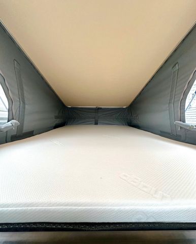 Aufstelldach family-for-4 Paket: Hybrid-Aufstelldach aus hochstabilem Sandwich, GFK-Dachbelag „Protect“, Matratzenunterlage zur Unterlüftung, Kunstleder-Bezug an der Dachinnenseite, Regenablaufrinne über der Schiebetür