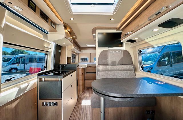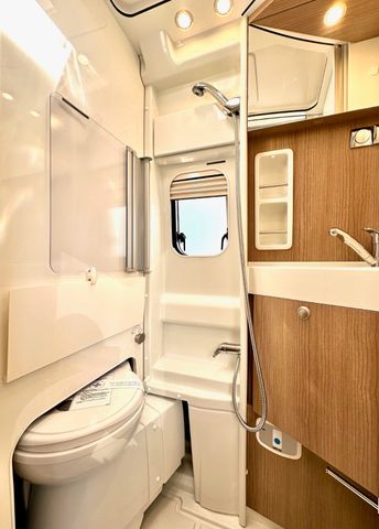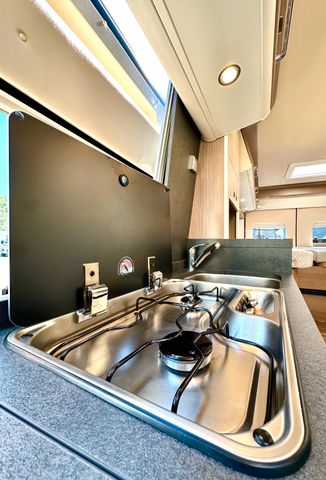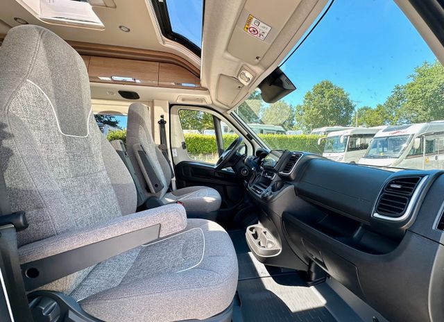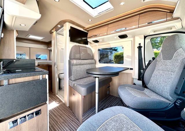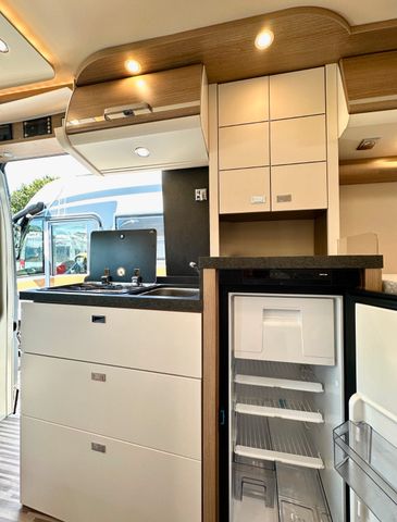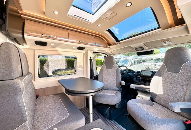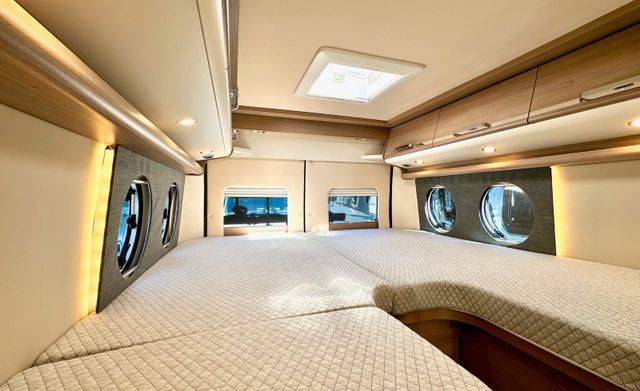 Aufbau-Paket:Dachinnenverkleidung mit Mikrofaser-Klimabelag, Deckenbaldachin Wohnraum mit indirekter LED-Ambientebeleuchtung, Upgrade Küchencenter, Qualitäts-Kaltschaummatratze im Heckbett, Truma CP Plus digitales Bedienpanel, Verzurrsystem Gepäckraum, Abwassertank in Gehäuse eingefasst und isoliert