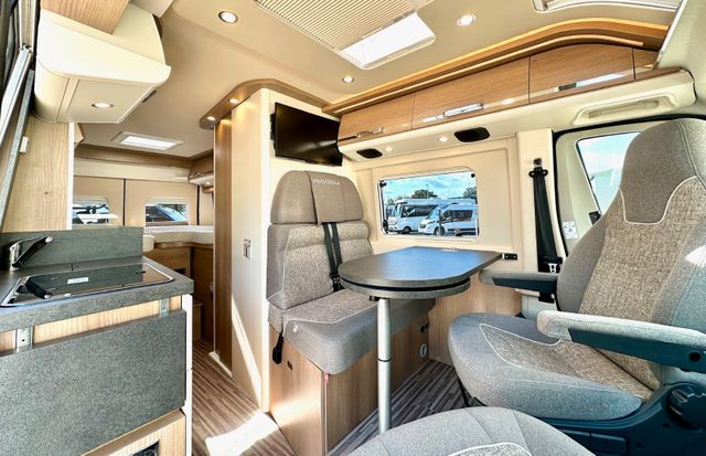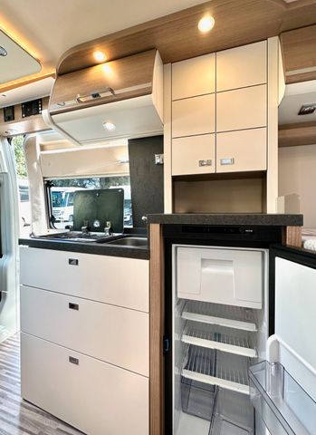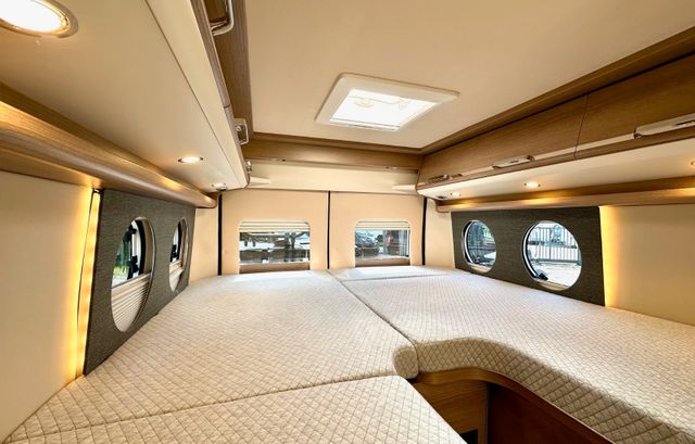 Aufbau-Paket:Dachinnenverkleidung mit Mikrofaser-Klimabelag, Deckenbaldachin Wohnraum mit indirekter LED-Ambientebeleuchtung, Upgrade Küchencenter, Qualitäts-Kaltschaummatratze im Heckbett, Truma CP Plus digitales Bedienpanel, Verzurrsystem Gepäckraum, Abwassertank in Gehäuse eingefasst und isoliert