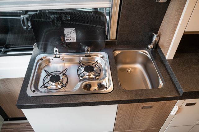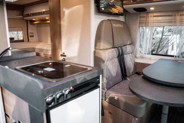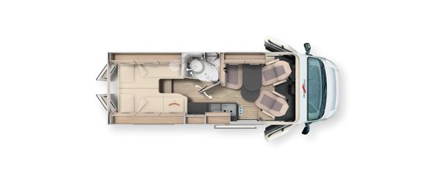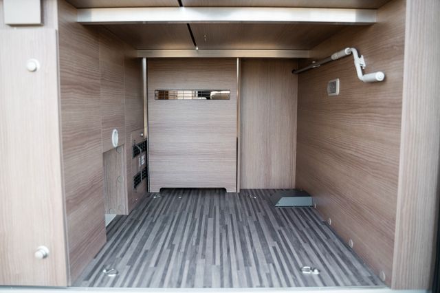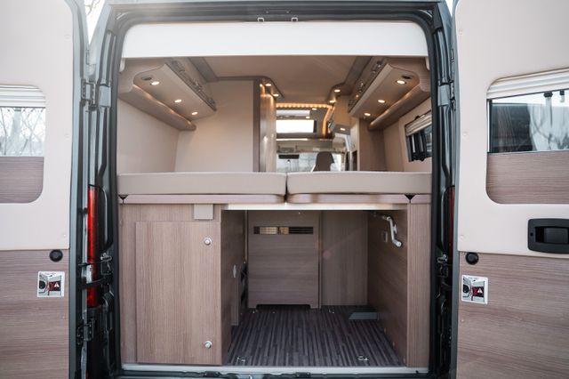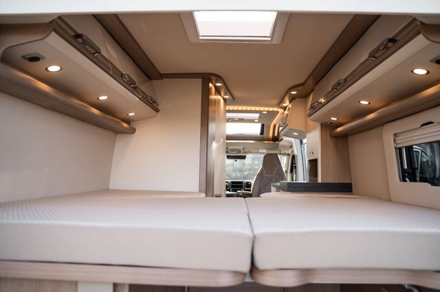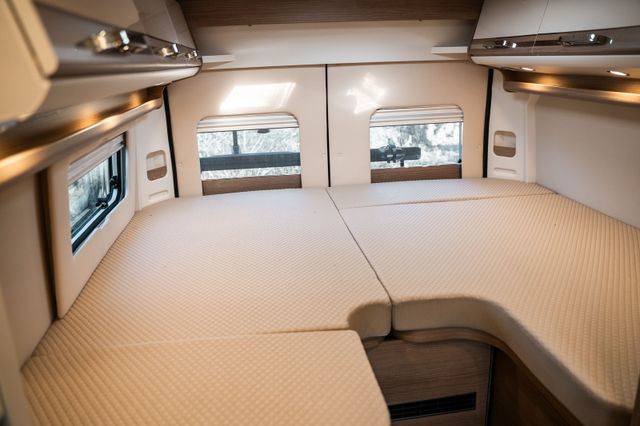 Aufbau-Paket:Dachinnenverkleidung mit Mikrofaser-Klimabelag, Deckenbaldachin Wohnraum mit indirekter LED-Ambientebeleuchtung, Upgrade Küchencenter, Qualitäts-Kaltschaummatratze im Heckbett, Truma CP Plus digitales Bedienpanel, Verzurrsystem Gepäckraum, Abwassertank in Gehäuse eingefasst und isoliert
