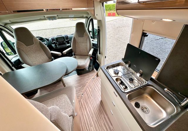 Aufbau-Paket:Dachinnenverkleidung mit Mikrofaser-Klimabelag, Deckenbaldachin Wohnraum mit indirekter LED-Ambientebeleuchtung, Upgrade Küchencenter, Qualitäts-Kaltschaummatratze im Heckbett, Truma CP Plus digitales Bedienpanel, Verzurrsystem Gepäckraum, Abwassertank in Gehäuse eingefasst und isoliert
