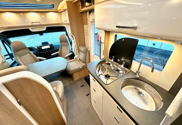 Basis-Plus-Paket:Chassis-Optionen: Radzierblenden, Halbautomatische Klimaanlage Tempmatik, Tempomat, Ladebooster, Vorderachse mit erhöhter Traglast, Lederlenkrad mit Option Multifunktionstasten (bei Schaltgetriebe inkl. Leder-Schalthebel), Kombiinstrument mit Farbdisplay, Regensensor, Elektrische Feststellbremse, Wärmedämmendes Glas mit Bandfilter an der Frontscheibe, Komfortfahrersitz mit Neigungs- und Höhenverstellung, Beifahrersitz mit Neigungsverstellung, Radiovorbereitung mit Dachantenne mit DAB+, Lautsprecher (4x), MBUX 10,2" Multimedia inkl. Navigation und DAB+, Verkehrszeichenassistent, Aufbau-Optionen: Dachluke Midi-Heki mit LED-Spots über L-Wohnsitzgruppe, Große Rollergaragentür auf der Fahrerseite, XL-Aufbautür „premium two 2.0“ (Breite 63 cm) mit Doppelverriegelung, Fenster- und Insektenschutzrollo, Lithium-Ionen-Batterie 90 Ah inkl. Batteriecomputer anstelle 80 Ah Gel-Batterie, SOG-Toilettenentlüftung, USB-Steckdose im Dachstauschrank über Heckbett