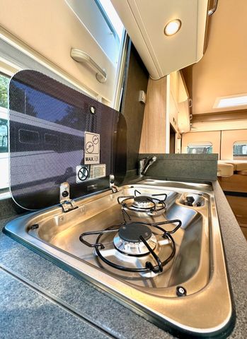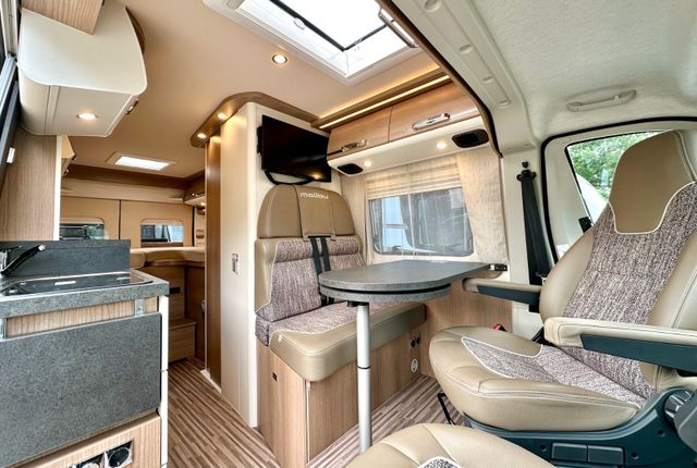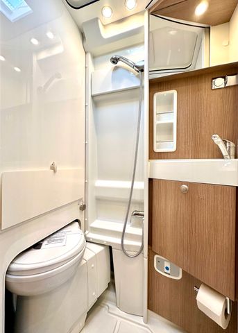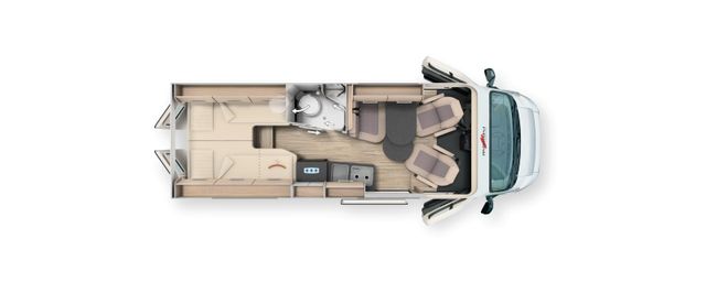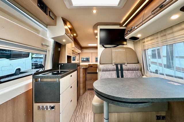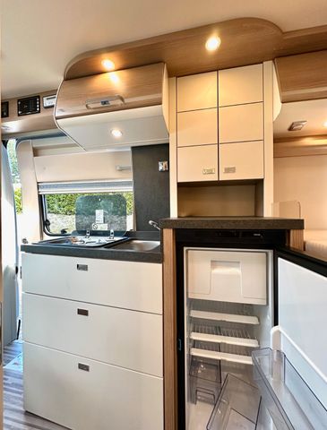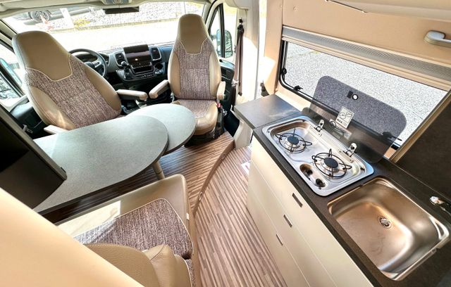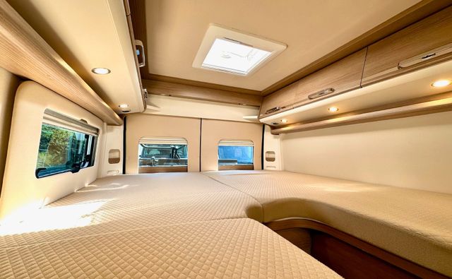 Aufbau-Paket:Dachinnenverkleidung mit Mikrofaser-Klimabelag, Deckenbaldachin Wohnraum mit indirekter LED-Ambientebeleuchtung, Upgrade Küchencenter, Qualitäts-Kaltschaummatratze im Heckbett, Truma CP Plus digitales Bedienpanel, Verzurrsystem Gepäckraum, Abwassertank in Gehäuse eingefasst und isoliert