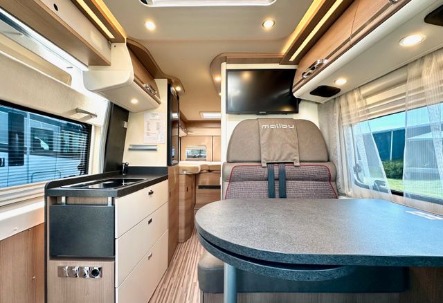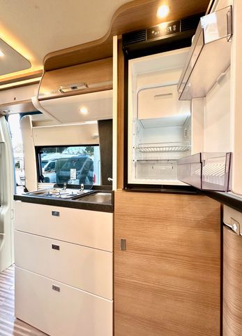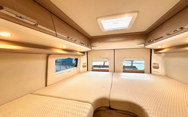 Aufbau-Paket:Dachinnenverkleidung mit Mikrofaser-Klimabelag, Deckenbaldachin Wohnraum mit indirekter LED-Ambientebeleuchtung, Upgrade Küchencenter, Qualitäts-Kaltschaummatratze im Heckbett, Truma CP Plus digitales Bedienpanel, Verzurrsystem Gepäckraum, Abwassertank in Gehäuse eingefasst und isoliert