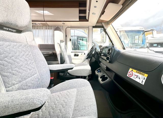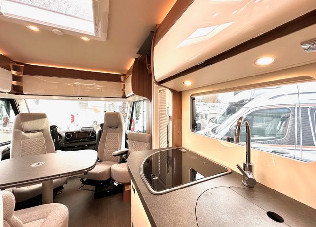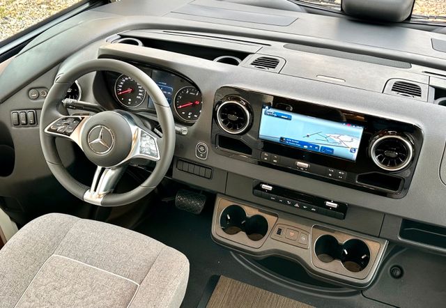 Basis-Plus-Paket:Chassis-Optionen: Radzierblenden, Halbautomatische Klimaanlage Tempmatik, Tempomat, Ladebooster, Vorderachse mit erhöhter Traglast, Kraftstofftank 92 Liter, Lederlenkrad mit Option Multifunktionstasten (bei Schaltgetriebe inkl. Leder-Schalthebel), Kombiinstrument mit Farbdisplay, Regensensor, Elektrische Feststellbremse, Fahrerhauskomfortsitze mit Neigungs- und Höhenverstellung (vorn / hinten), Radiovorbereitung mit Dachantenne mit DAB+, Lautsprecher (4x), MBUX 10,2" Multimedia inkl. Navigation und DAB+, Verkehrszeichenassistent; Aufbau-Optionen: Dachluke Midi-Heki mit LED-Spots über L-Wohnsitzgruppe, Große Rollergaragentür auf der Fahrerseite, XL-Aufbautür „premium two 2.0“ (Breite 63 cm) mit Doppelverriegelung, Fenster- und Insektenschutzrollo, SOG-Toilettenentlüftung, Abwasserschlauchset zur komfortablen Entsorgung, USB-Steckdose im Dachstauschrank über Heckbett, Vorbereitung Dachhaubenlüfter elektrisch, Vorbereitung Solaranlage, Vorbereitung Sat-Anlage, Vorbereitung Rückfahrkamera (Einzellinse)